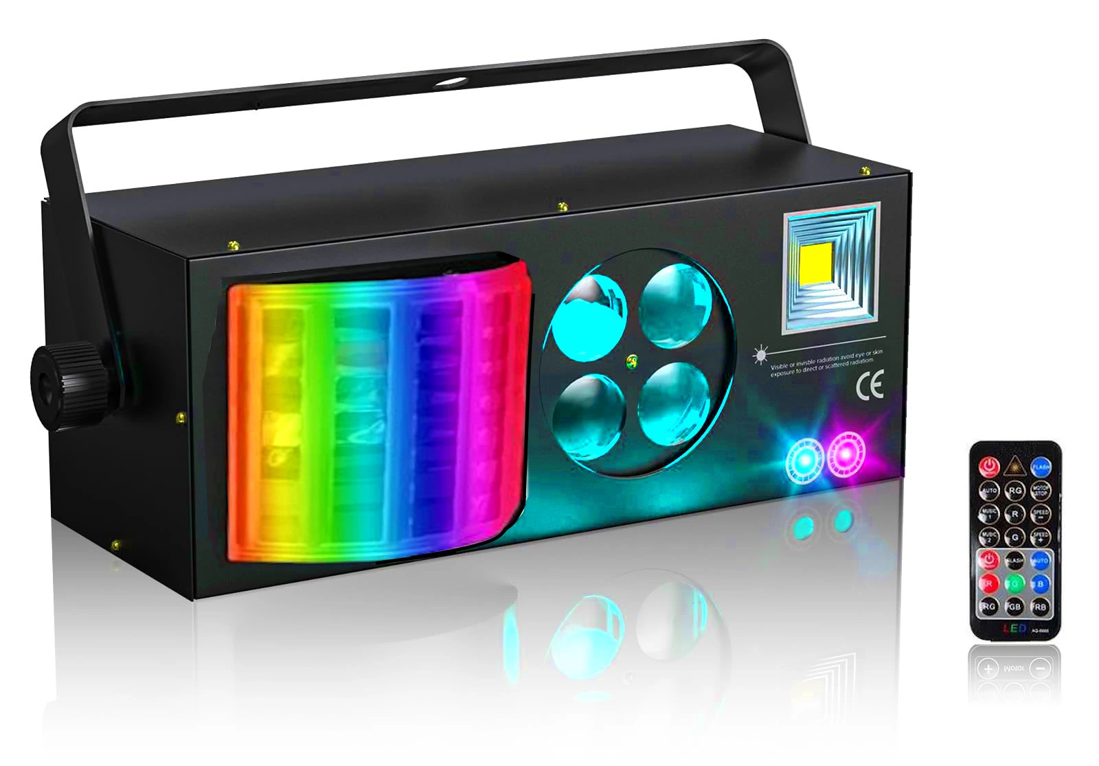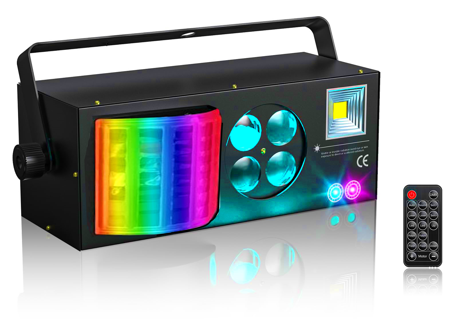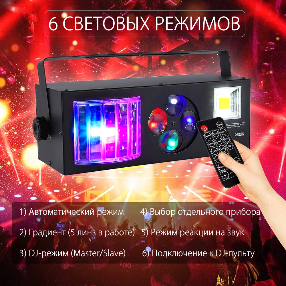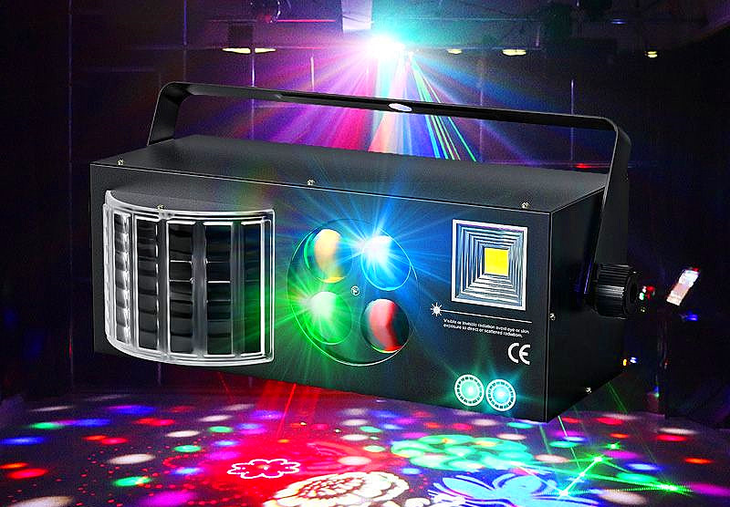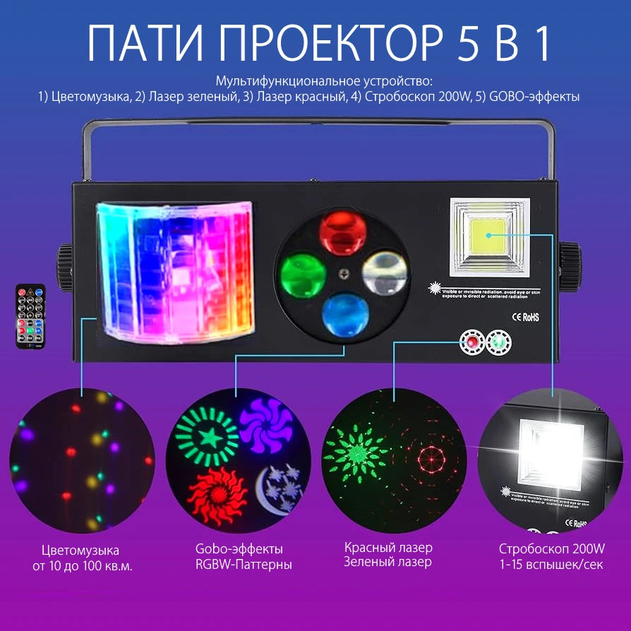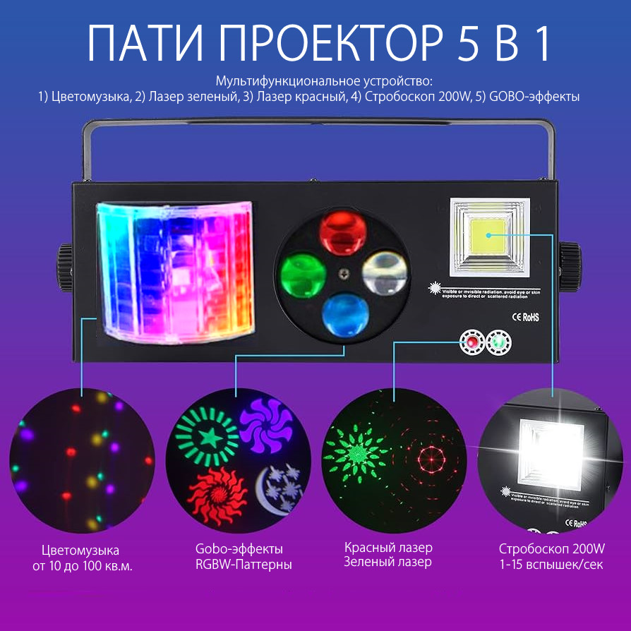 Стробоскоп, цветомузыка, GOBO, и лазерный проектор в одном устройстве. Используется на празднике,
